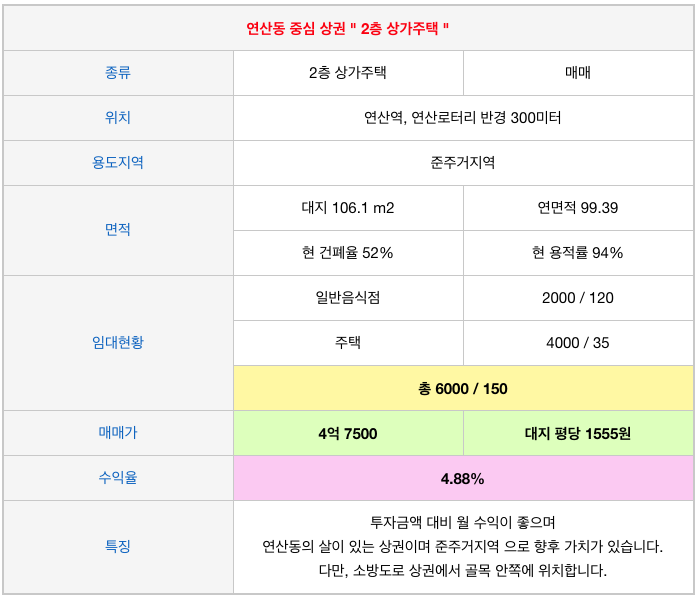 연산동 연산로터리 인근 2층상가주택 : 수익율좋은
