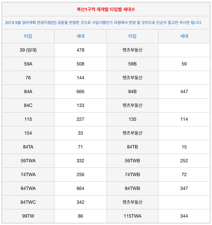 복산1구역 재개발의 타입별 세대수는 아래와 같이 발표가 되었으나