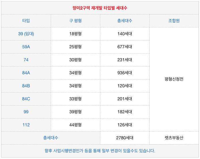 망미2구역 주택재개발의 타입별 세대수 입니다.