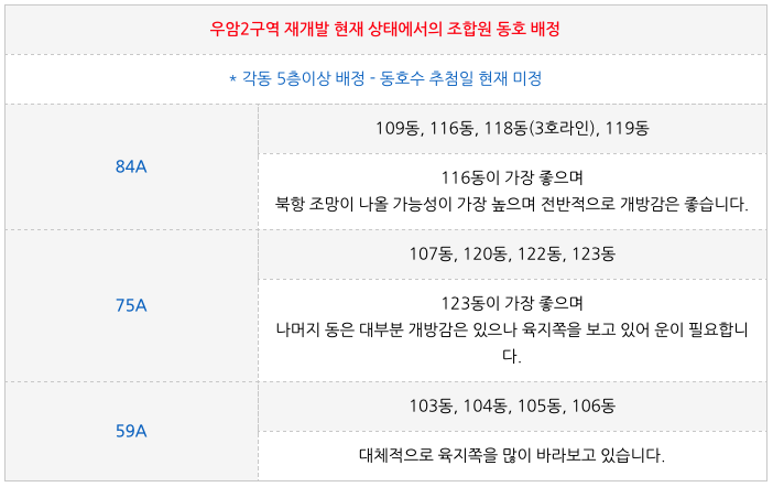 현재의 설계 상황에서의 조합원 분들의 동호수 배정 내용입니다.