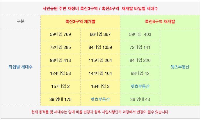 특히, 촉진4구역은 일반 분양 숫자가 작기 때문에 타입별 세대수가 변화가 필수적으로 필요할 것으로 보입니다.