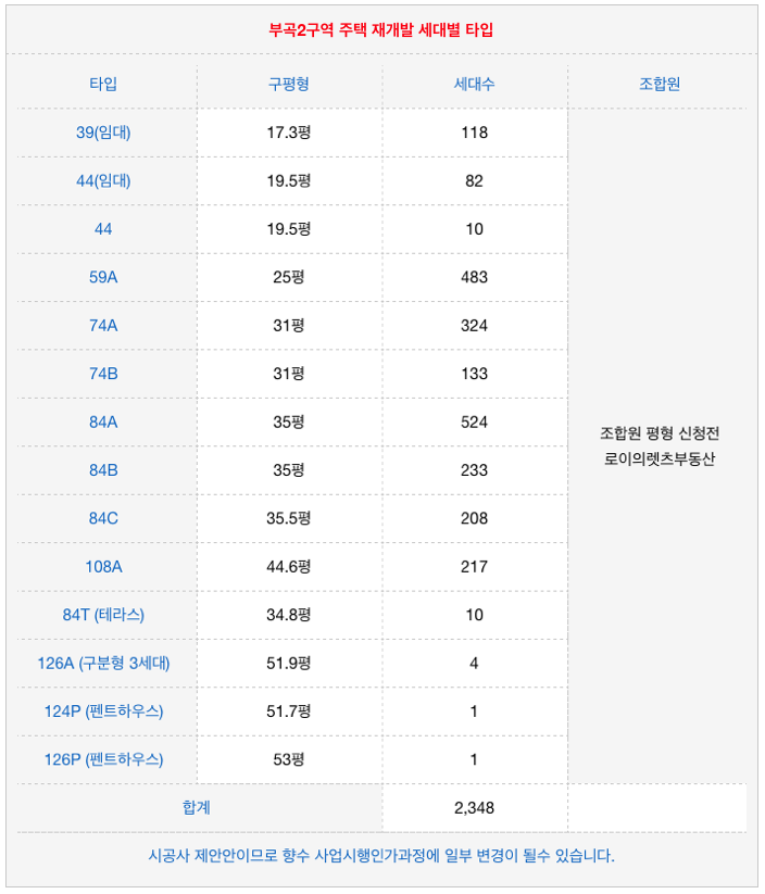 부곡2구역 재개발은 각 평형 타입별 세대수입니다.