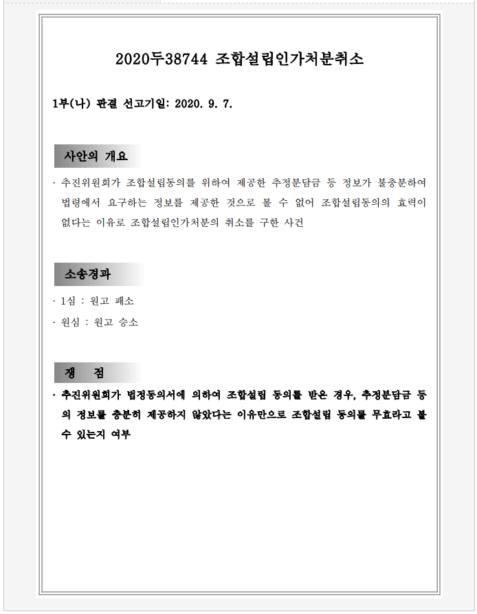 조합 설립의 취소소송에서 어제 9월 7일 대법원 판결이 나왔습니다.