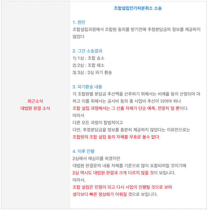 그동안 진행에 있어 시간적 RISK가 되어 조합원 분들의 큰 걱정거리 였떤