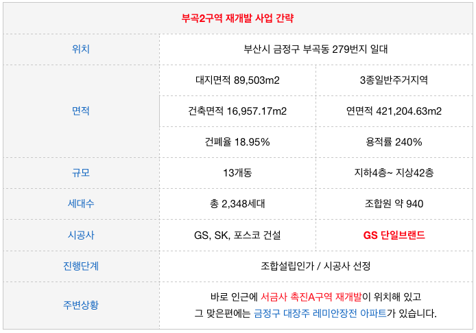 부곡2구역 재개발의 간략한 특징들 입니다.
