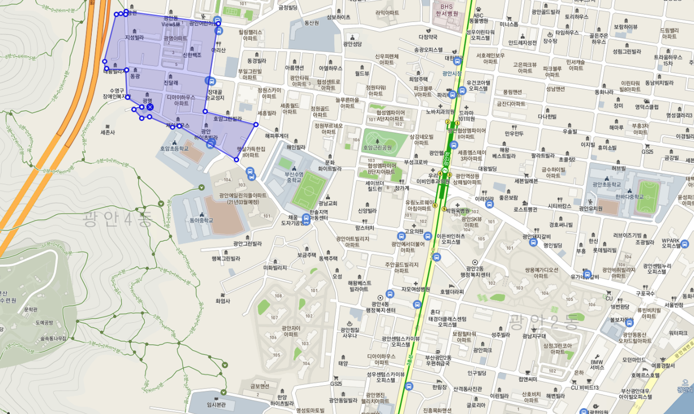 바로 인근의 광안2구역 (광안SK), 광안자이, 에일린의 뜰로 이어지는 2500여세대의 아파트 단지의 끝자락으로