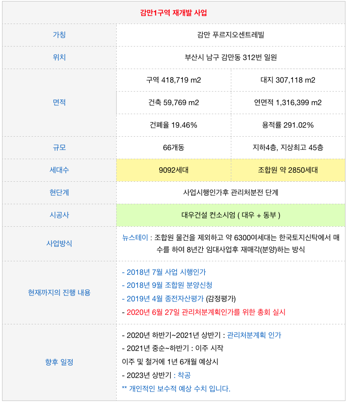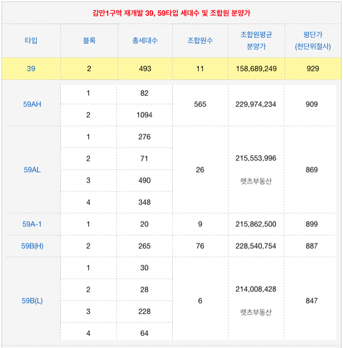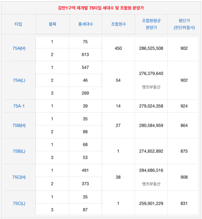 감만1구역 재개발의 타입별 전체 세대수 그리고 조합원수 그리고 조합원 분양가를 정리해 드립니다.