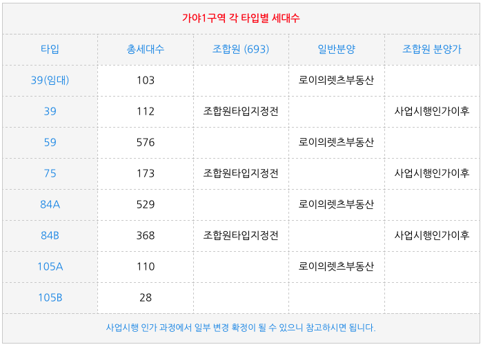 가야1구역 재개발의 각 타입별 세대수 입니다.