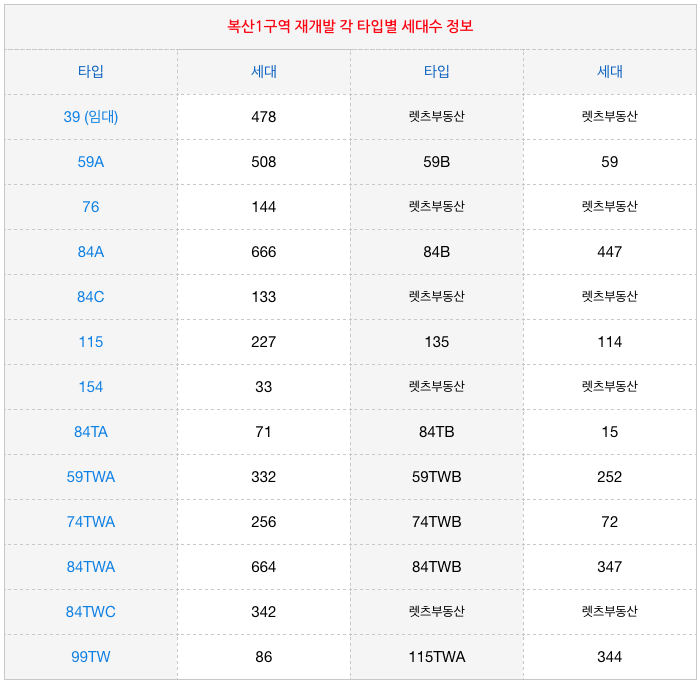 복산1구역 재개발의 각 타입별 세대수 입니다.