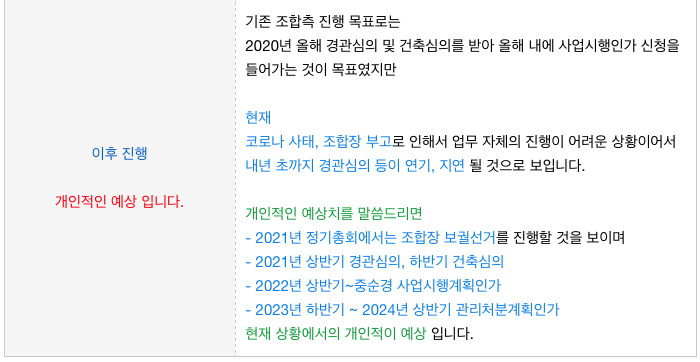 - 향후 관리처분이후 이주비대출 시점 또는 단지가 들어선 후 가치가 더 기대가 되기에 길게보시는 것이 좋습니다.