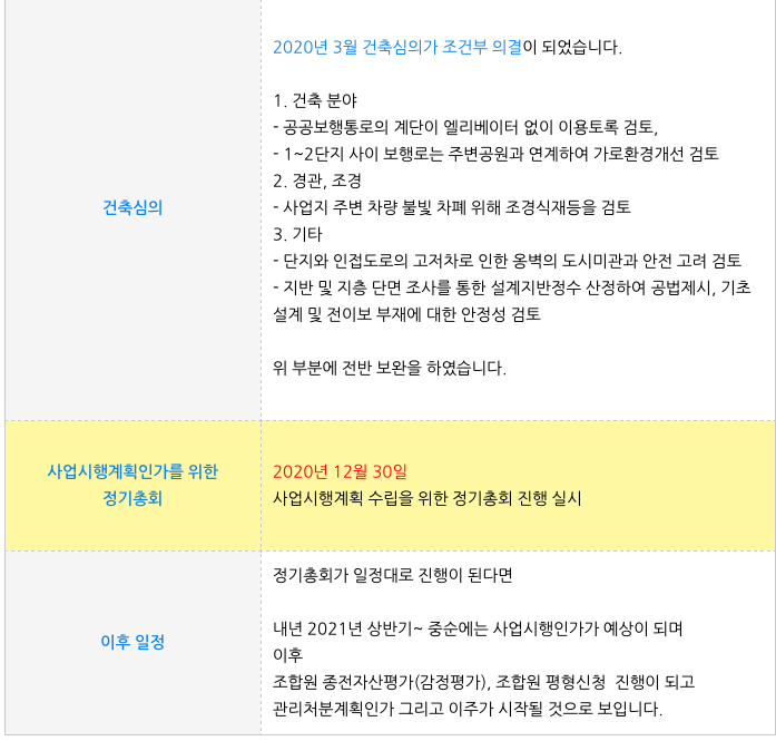 과거 시공사 변경이 되는 등의 어려움을 겪었지만 이제 사업시행계획인가를 위한 총회를 앞두고 있어서
