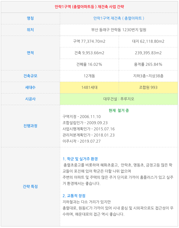 안락1구역 충렬아파트를 중심으로 주위의 주택과 맨션등을 포함한 재건축 구역입니다.