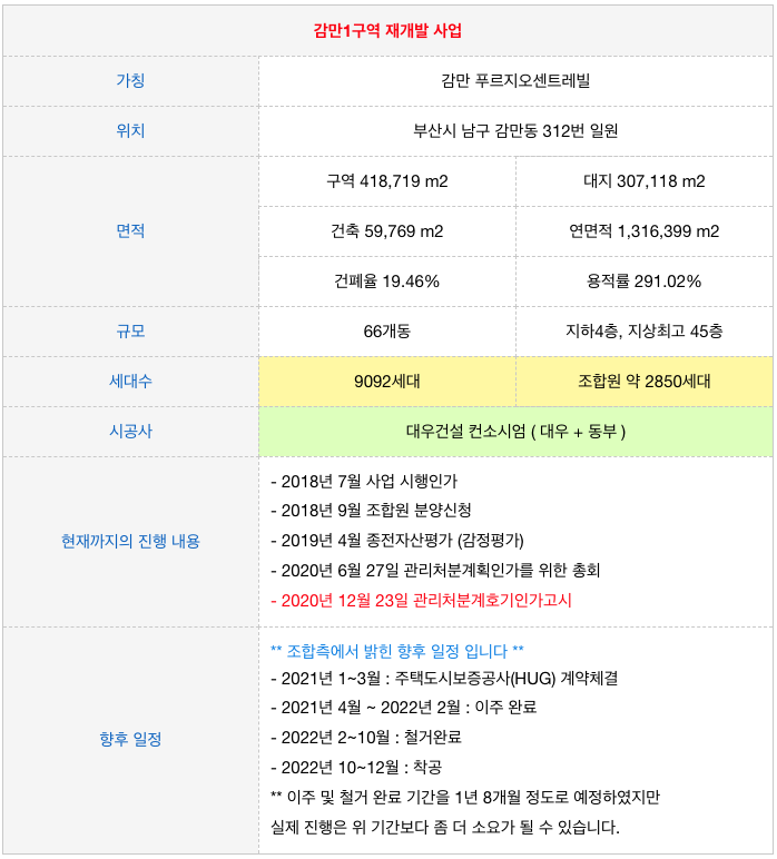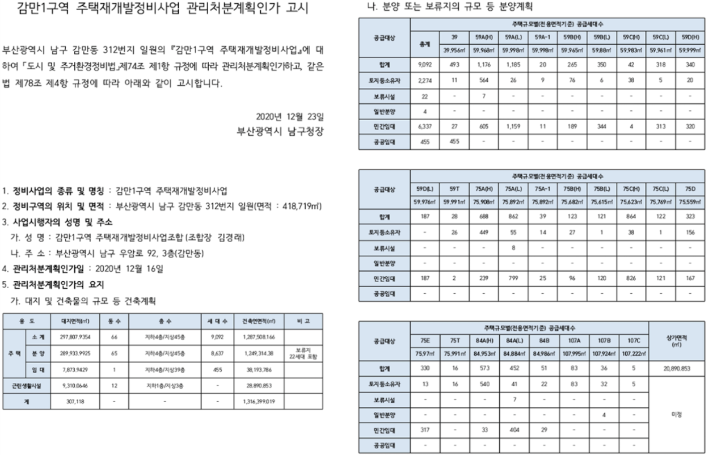 감만1구역 재개발은 지난 2020년 12월 23일 부산 남구청으로부터 관리처분계획인가를 받았습니다.