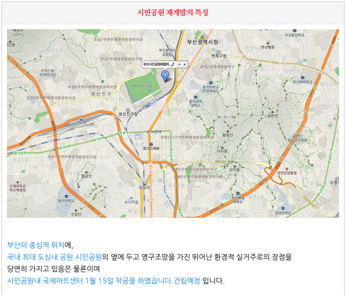 시민공원 재개발에서 3500여세대가 가장 큰 대단지로 부산 시민공원의 동쪽에 위치하여