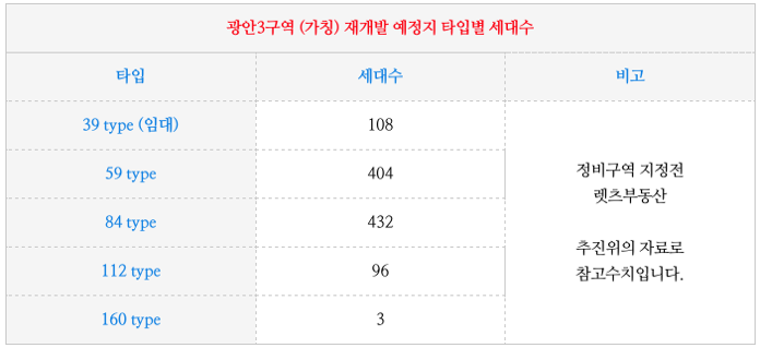 광안3구역 (가칭) 재개발 예정지 타입별 세대수는 아래와 같습니다.
