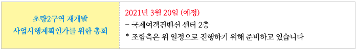 초량2구역 재개발은 3월 20일 사업시행계획인가를 위한 총회를 예정하고 있습니다.