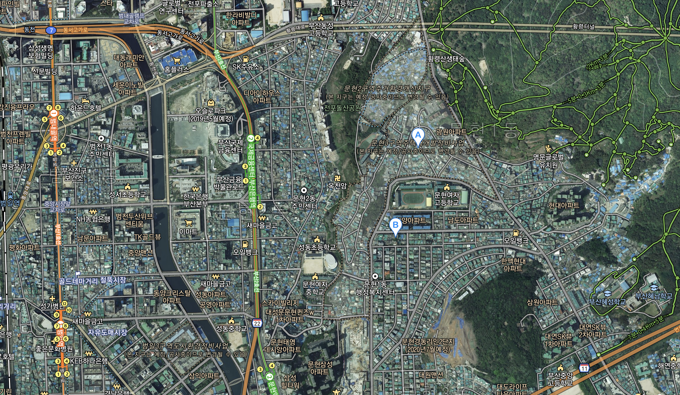 중심부와 상단은 부산 금융센터단지역에서는 직선거리는 300여미터밖에 되지 않지만 접근도로가 좋지 않아