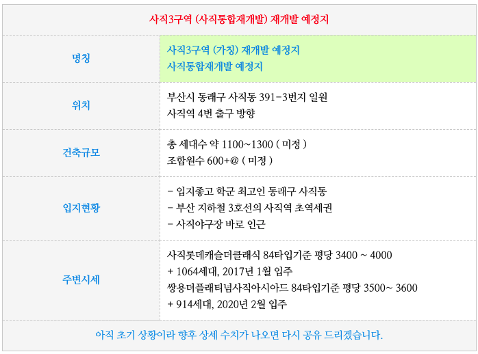 사직3구역 (사직통합) 재개발 예정지 의 진행상황 등은 아래 페이지를 확인부탁드립니다.