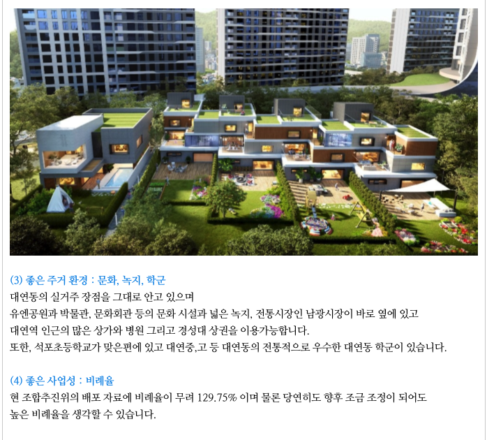 주변의 좋은 녹지, 문화 공간들이 있고 대연동이라는 실거주 환경이 좋은 곳에 위치하며