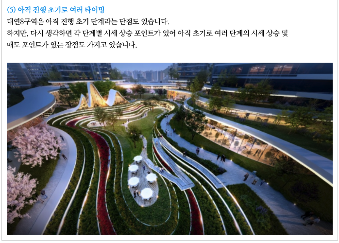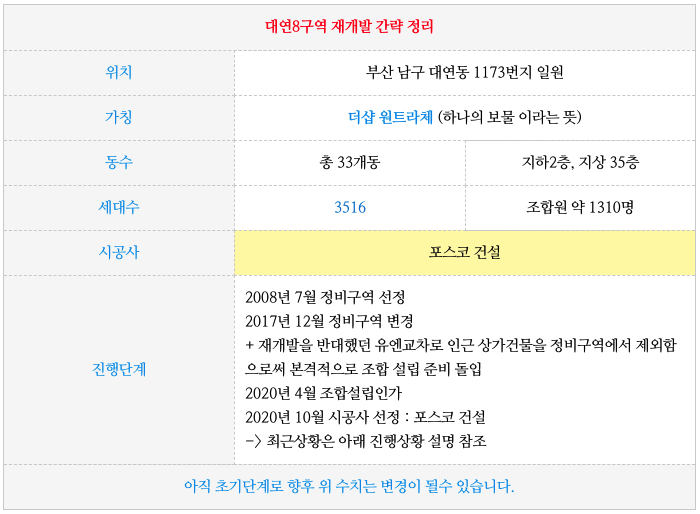 대연8구역 재개발의 간략한 특징들입니다.