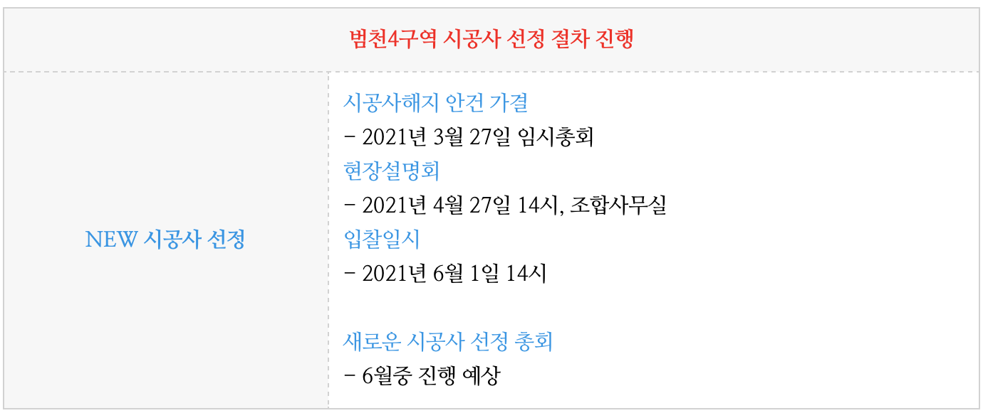 이에 따라, 현재 새로운 시공사 선정 작업이 진행중에 있습니다.