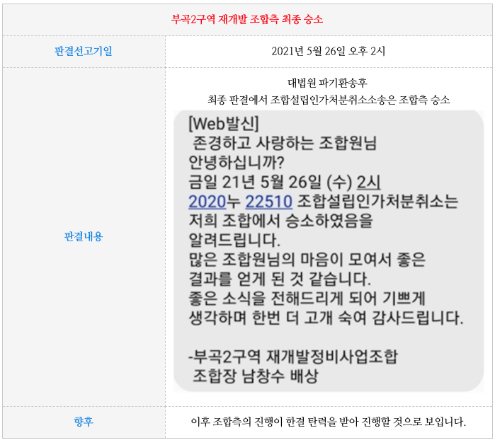 - 조합측이 최종 승소를 하게 되면서 향후 진행에 보다 힘을 받을 것으로 보입니다.
