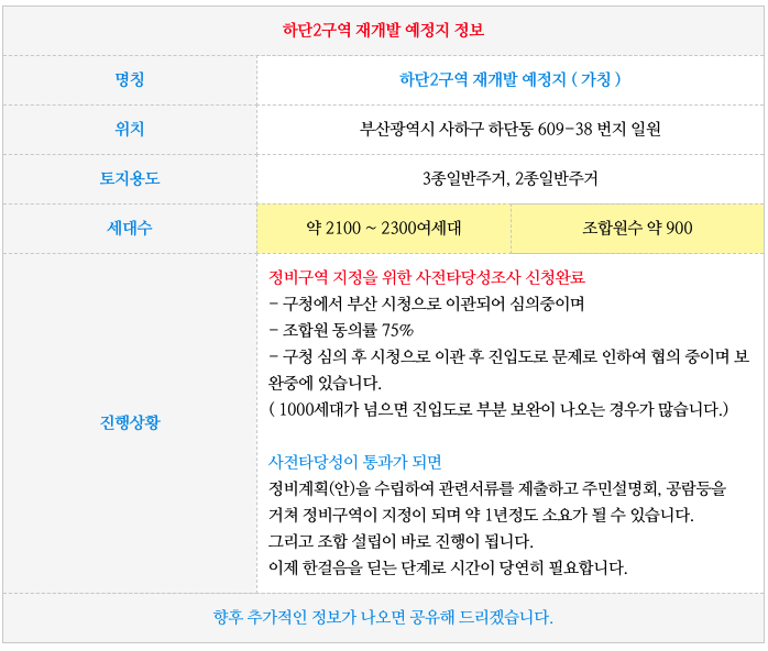 하단2구역 재개발 예정지의 특징 및 진행 상황등 더 자세한 정보는 아래 페이지를 확인 부탁드립니다.