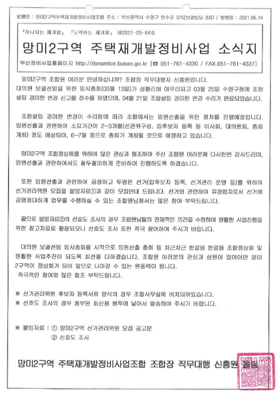 오랜동안 진행에 어려움을 겪었던 망미2구역 재개발은 드디어 정상화를 위한 마지막 단계를 앞두고 있습니다.