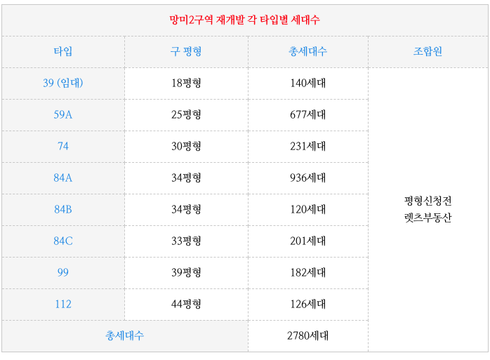 망미2구역 재개발의 현재 각 타입별 세대수 입니다.