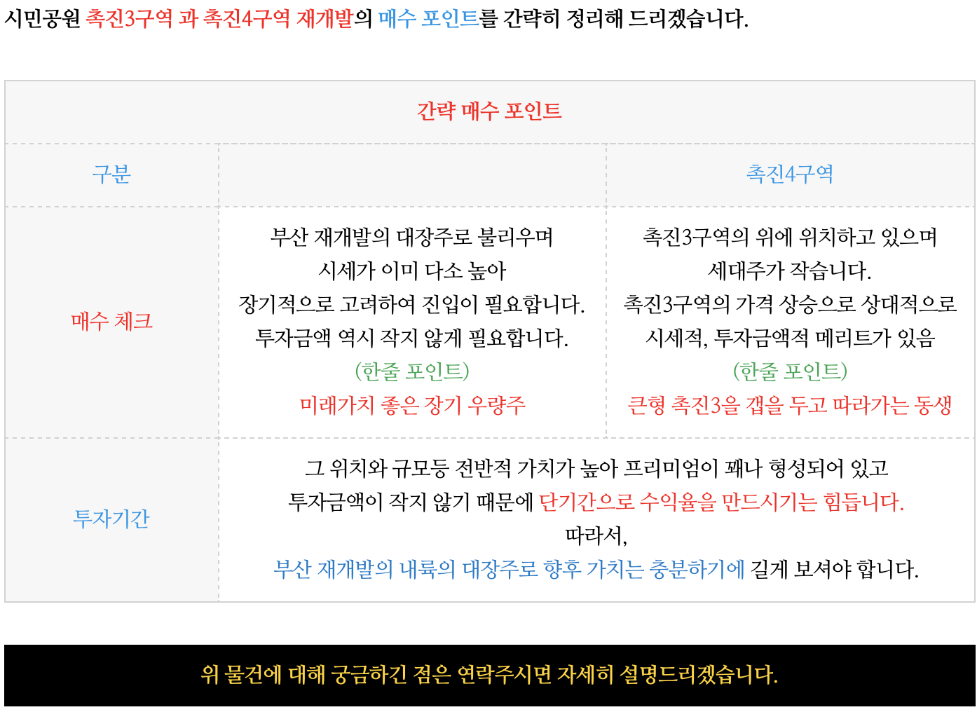 시민공원 촉진3구역과 촉진4구역 재개발에 관심이 있으신 분들은 연락주시면 자세히 설명드리겠습니다.