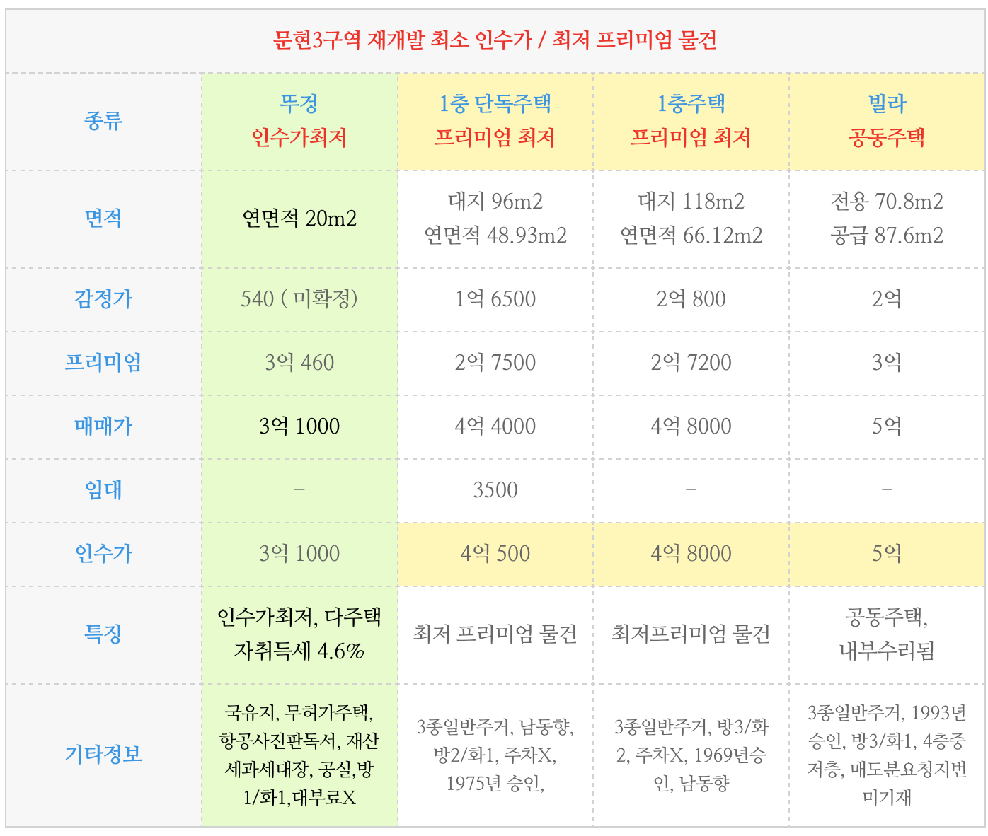 1. 최소 인수가 물건 or 최저 프리미엄 물건 등