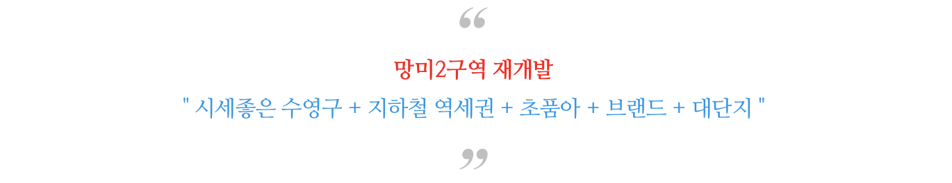 수영구라는 태생 자체가 좋은 재개발 구역으로 역세권의 평지로 그 입지적 가치는 대단히 좋은 곳입니다.