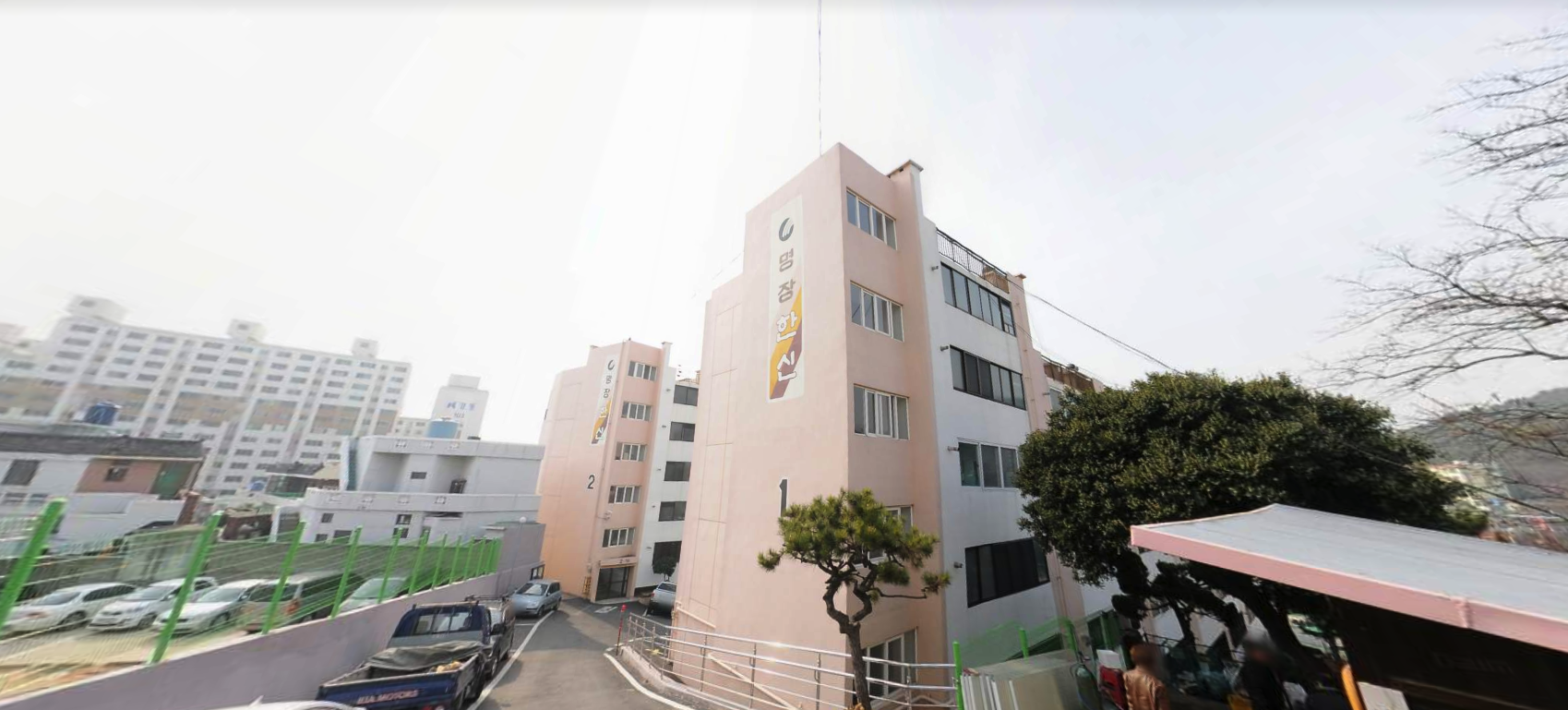 명장한신의 왼쪽편으로 명장2구역 재개발 예정지, 그리고 윗쪽으로 명장2동 재개발 예정지가 있고