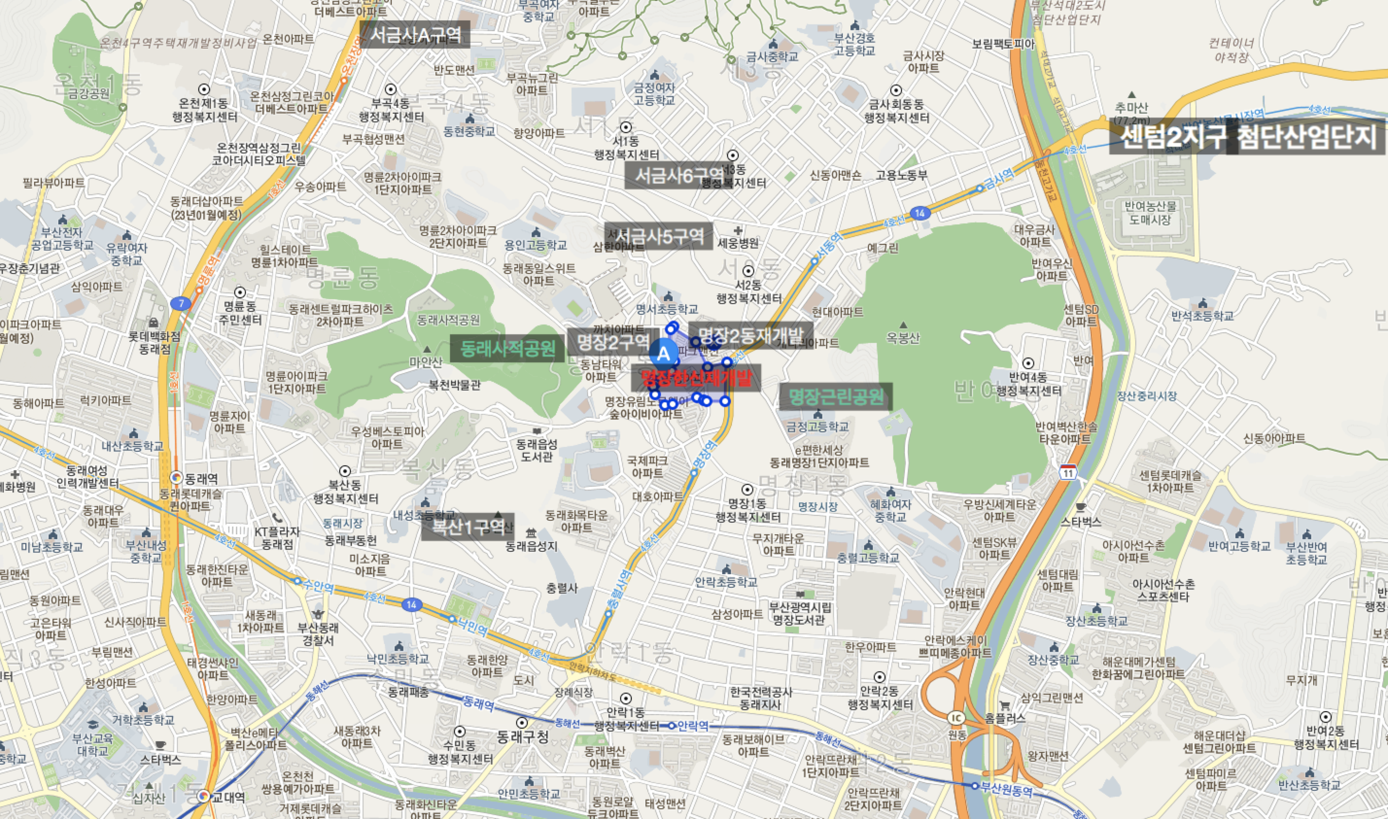 위쪽으로 명장동의 재개발 구역들과 함께 서금사5구역 재개발이 진행되고 있어 주변일대가 크게