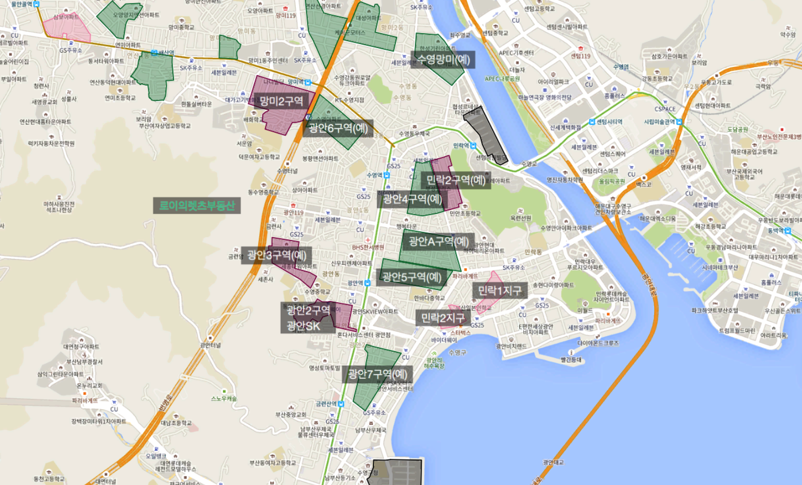 수영구 광안동의 여러 재개발 예정지를 개별적으로 구역지도, 물건등을 정리하여 소개해 드립니다.