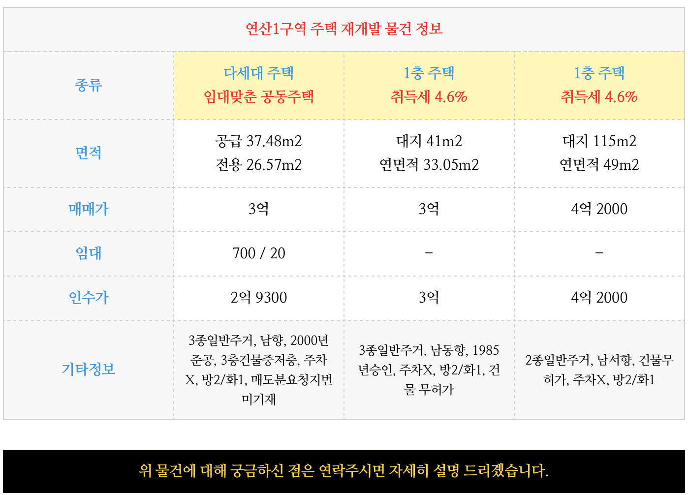 연산1구역 재개발 예정지에 대해 궁금하신 점은 연락주시면 자세히 설명 드리겠습니다.