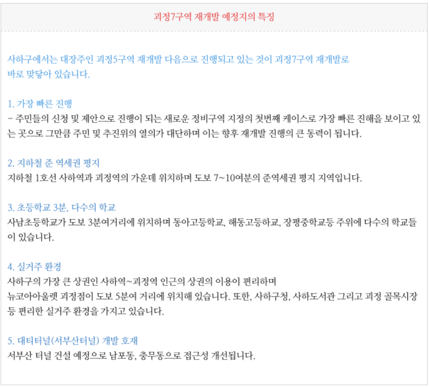 사하구의 빠른 예정지 괴정7구역 재개발 의 간략한 특징입니다.