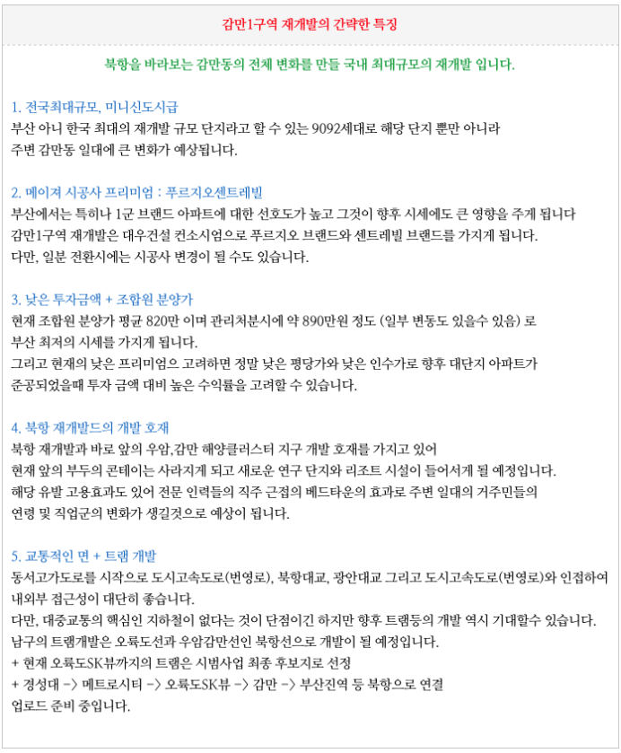 최대단지 감만1구역 재개발의 특징을 간략히 정리하였습니다.