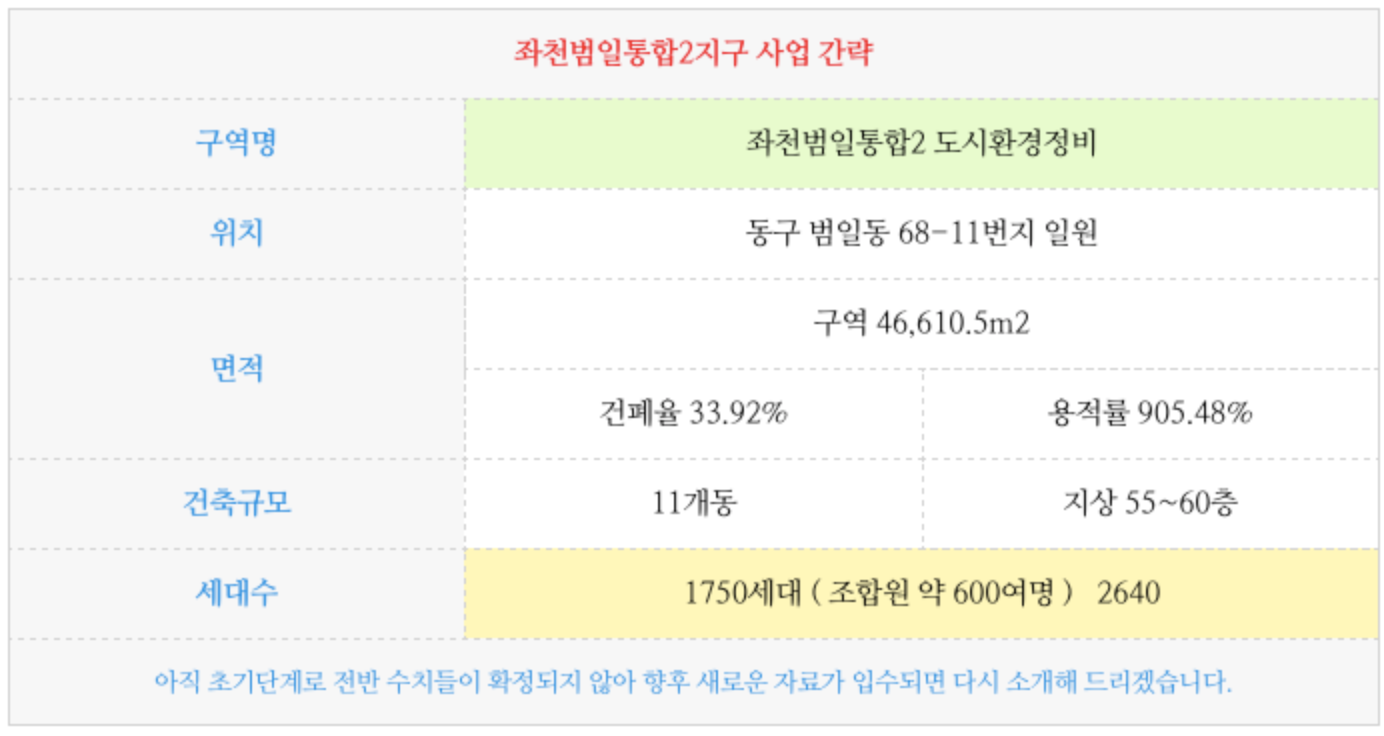 좌천범일통합2지구의 진행상황과 추가적인 정보는 아래 페이지를 통해 확인하실수 있습니다.
