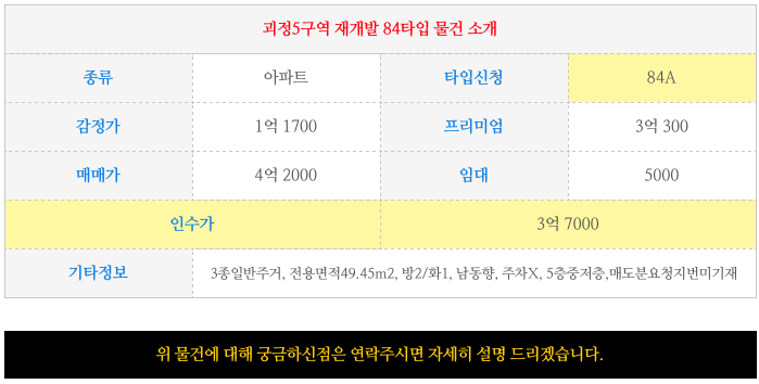사하구 대장주 괴정5구역 재개발 84타입 인수가 괜찮은 물건을 소개해 드리겠습니다.