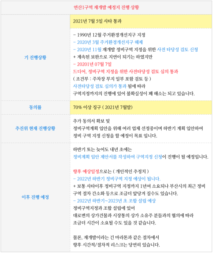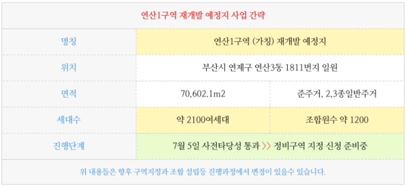 이에 부산의 많은 다른 주환지구들이 연산1구역의 진행절차, 단계. 시간등에 큰 관심을 가지고 있습니다.
