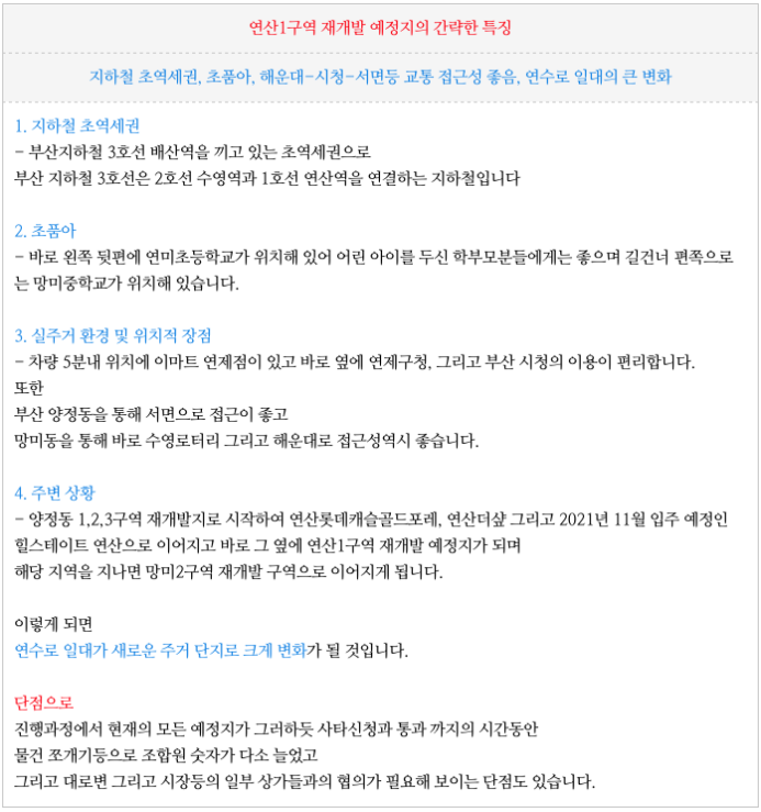 연산1구역 재개발 예정지의 특징을 간략히 정리하였습니다.