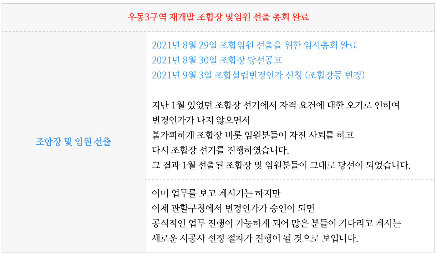 우동3구역 재개발의 최근 소식은 새로운 임원 선출 소식 입니다.