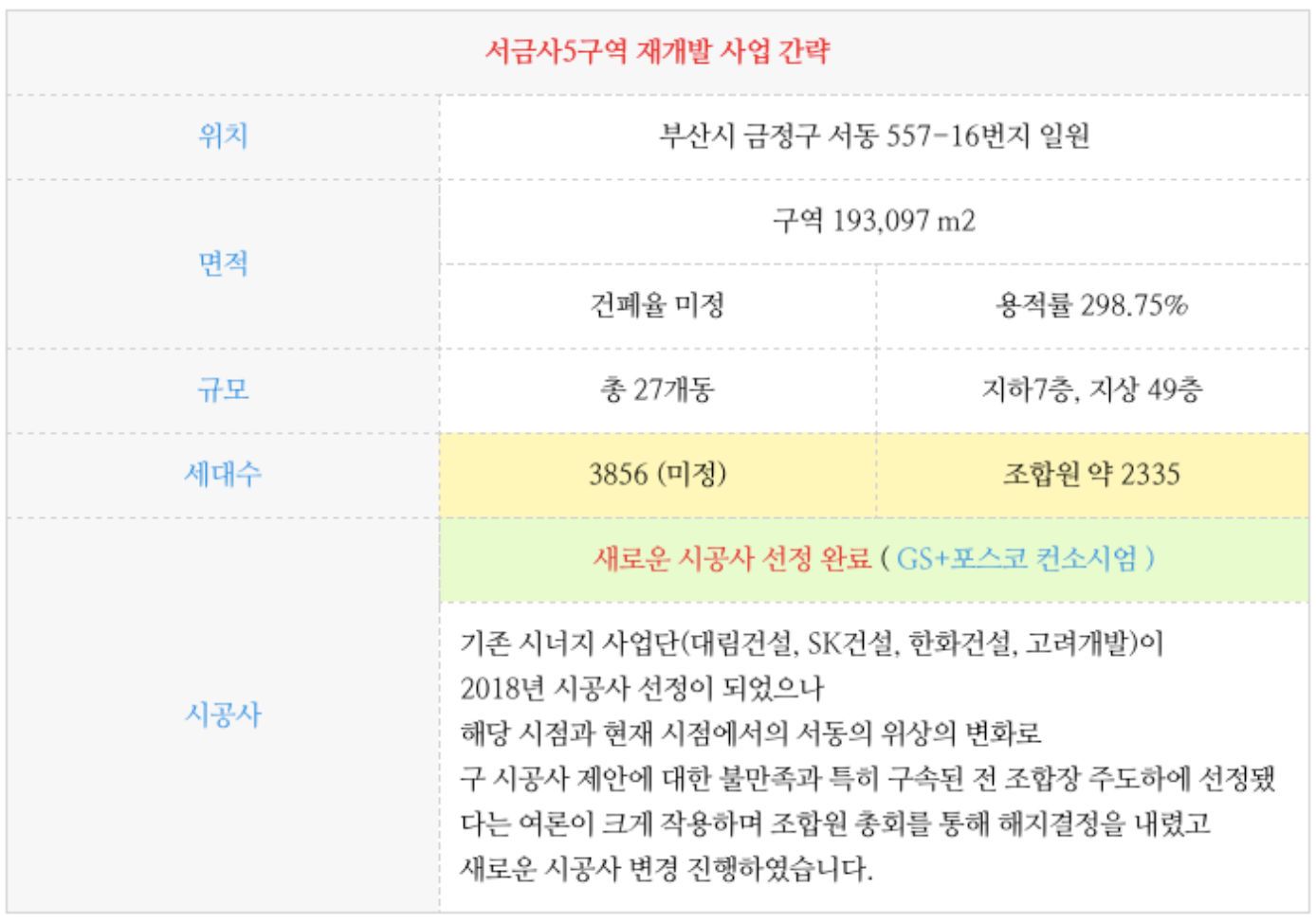 - 총세대수 2808세대로 서금사5구역과 동일하게 기존 시공사인 반도, 중흥컨소시엄과 계약 해지조합원 총회를 진행하였고 이제 시공사 선정공고등으로 새로운 시공사 선정 절차를 앞두고 있습니다.