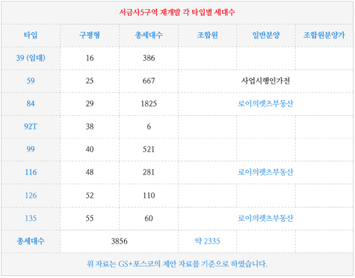 서금사5구역 재개발의 각 타입(평형)별 배정 세대수 입니다.