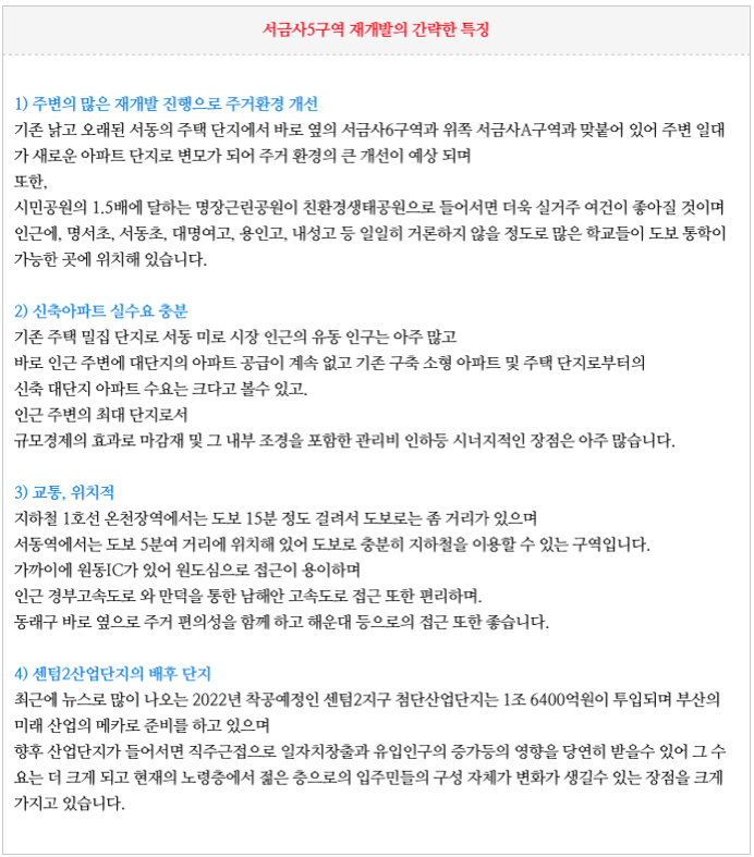 서금사5구역 재개발의 간략한 특징을 정리하였습니다.