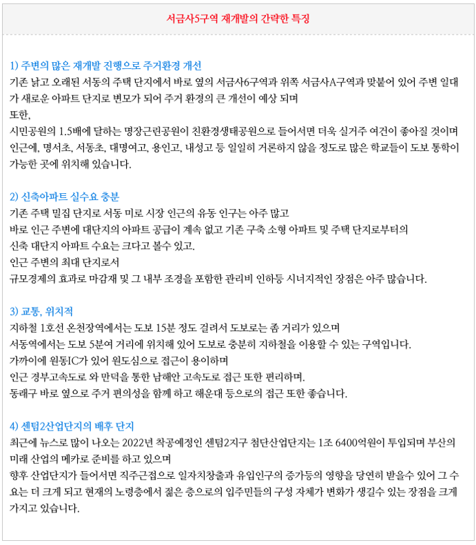 서금사5구역 재개발의 간략한 특징을 정리하였습니다.