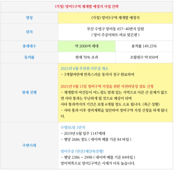 (가칭) 망미5구역 재개발 예정지 에 대해 궁금하신 점은 연락주시면 자세히 설명 드리도록 하겠습니다.