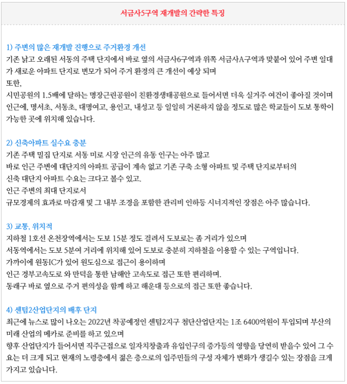 서금사5구역 재개발의 간략한 특징을 정리하였습니다.