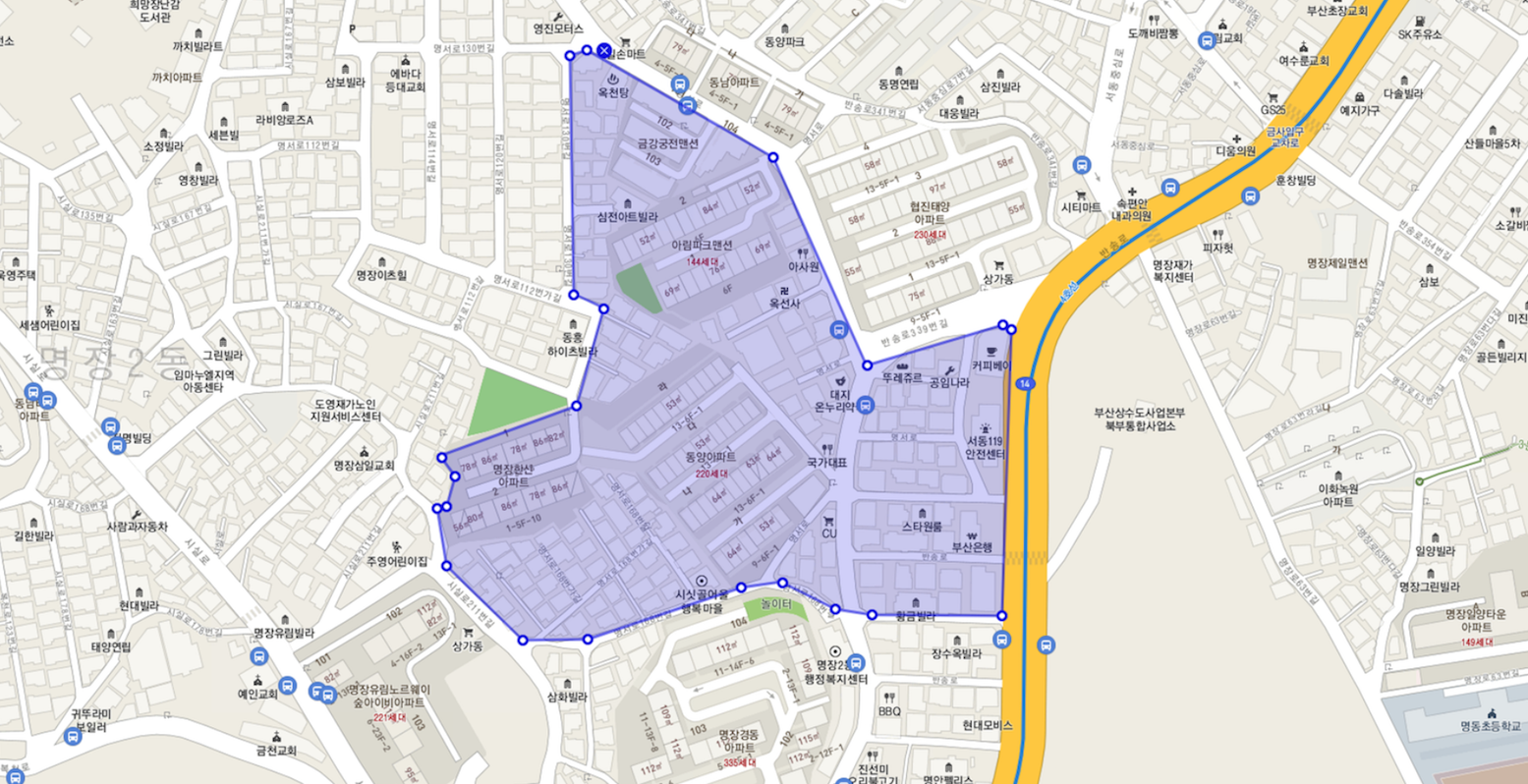 명장동의 한신, 동양, 아림파크등 저층 아파트들과 함께 접해있는 주변의 인근 주택가를 포함하여